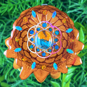 Our handmade pendants are crafted from sustainably wild-gathered Knobcone Pinecones. Every Aura Pinecone is carefully dried, aged, and cross-sectioned before being meticulously designed.