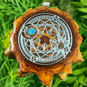Our handmade pendants are crafted from sustainably wild-gathered Knobcone Pinecones. Every Aura Pinecone is carefully dried, aged, and cross-sectioned before being meticulously designed.