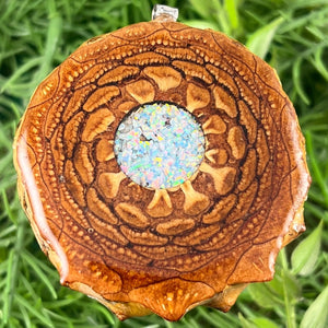 Our handmade pendants are crafted from sustainably wild-gathered Knobcone Pinecones. Every Aura Pinecone is carefully dried, aged, and cross-sectioned before being meticulously designed.