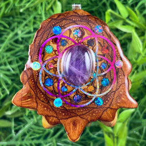 Our handmade pendants are crafted from sustainably wild-gathered Knobcone Pinecones. Every Aura Pinecone is carefully dried, aged, and cross-sectioned before being meticulously designed.