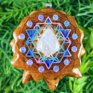 Our handmade pendants are crafted from sustainably wild-gathered Knobcone Pinecones. Every Aura Pinecone is carefully dried, aged, and cross-sectioned before being meticulously designed.