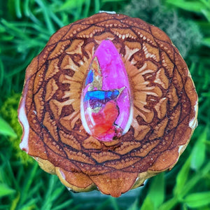 Our handmade pendants are crafted from sustainably wild-gathered Knobcone Pinecones. Every Aura Pinecone is carefully dried, aged, and cross-sectioned before being meticulously designed.