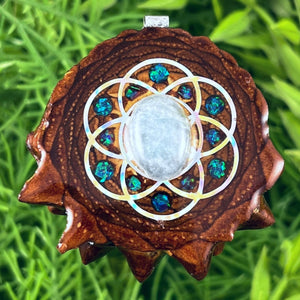 Our handmade pendants are crafted from sustainably wild-gathered Knobcone Pinecones. Every Aura Pinecone is carefully dried, aged, and cross-sectioned before being meticulously designed.