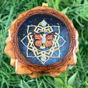 Our handmade pendants are crafted from sustainably wild-gathered Knobcone Pinecones. Every Aura Pinecone is carefully dried, aged, and cross-sectioned before being meticulously designed.