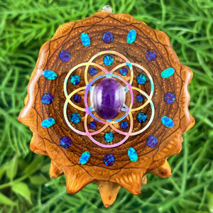 Our handmade pendants are crafted from sustainably wild-gathered Knobcone Pinecones. Every Aura Pinecone is carefully dried, aged, and cross-sectioned before being meticulously designed.