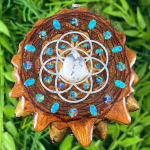 Our handmade pendants are crafted from sustainably wild-gathered Knobcone Pinecones. Every Aura Pinecone is carefully dried, aged, and cross-sectioned before being meticulously designed.