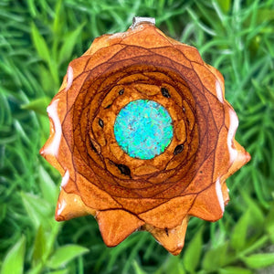 Our handmade pendants are crafted from sustainably wild-gathered Knobcone Pinecones. Every Aura Pinecone is carefully dried, aged, and cross-sectioned before being meticulously designed.