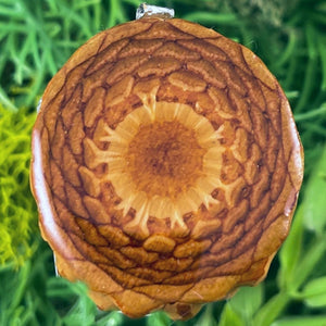 Our handmade pendants are crafted from sustainably wild-gathered Knobcone Pinecones. Every Aura Pinecone is carefully dried, aged, and cross-sectioned before being meticulously designed.