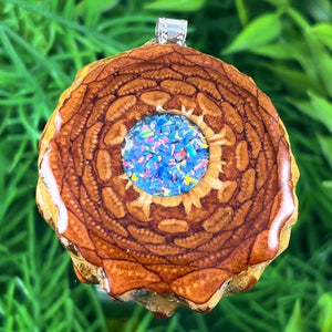 Our handmade pendants are crafted from sustainably wild-gathered Knobcone Pinecones. Every Aura Pinecone is carefully dried, aged, and cross-sectioned before being meticulously designed.