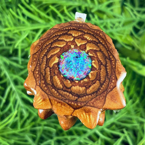 Our handmade pendants are crafted from sustainably wild-gathered Knobcone Pinecones. Every Aura Pinecone is carefully dried, aged, and cross-sectioned before being meticulously designed.
