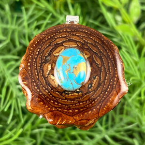 Our handmade pendants are crafted from sustainably wild-gathered Knobcone Pinecones. Every Aura Pinecone is carefully dried, aged, and cross-sectioned before being meticulously designed.