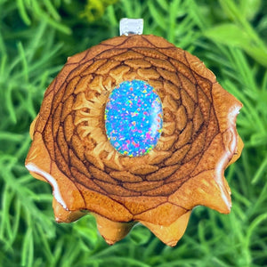 Our handmade pendants are crafted from sustainably wild-gathered Knobcone Pinecones. Every Aura Pinecone is carefully dried, aged, and cross-sectioned before being meticulously designed.