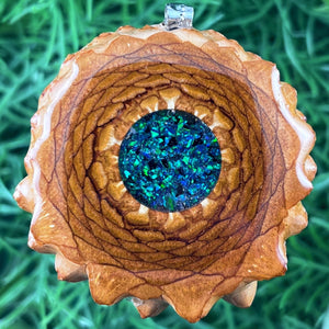 Our handmade pendants are crafted from sustainably wild-gathered Knobcone Pinecones. Every Aura Pinecone is carefully dried, aged, and cross-sectioned before being meticulously designed.