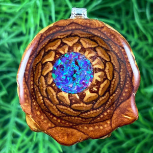 Our handmade pendants are crafted from sustainably wild-gathered Knobcone Pinecones. Every Aura Pinecone is carefully dried, aged, and cross-sectioned before being meticulously designed.