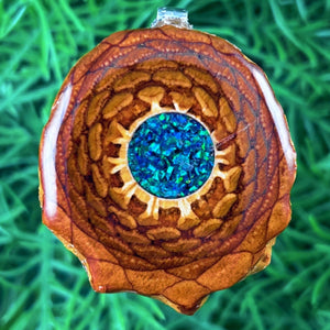 Our handmade pendants are crafted from sustainably wild-gathered Knobcone Pinecones. Every Aura Pinecone is carefully dried, aged, and cross-sectioned before being meticulously designed.