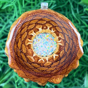 Our handmade pendants are crafted from sustainably wild-gathered Knobcone Pinecones. Every Aura Pinecone is carefully dried, aged, and cross-sectioned before being meticulously designed.