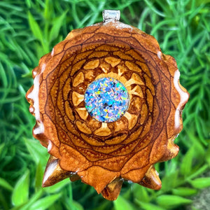 Our handmade pendants are crafted from sustainably wild-gathered Knobcone Pinecones. Every Aura Pinecone is carefully dried, aged, and cross-sectioned before being meticulously designed.