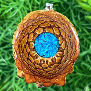 Our handmade pendants are crafted from sustainably wild-gathered Knobcone Pinecones. Every Aura Pinecone is carefully dried, aged, and cross-sectioned before being meticulously designed.