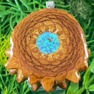 Our handmade pendants are crafted from sustainably wild-gathered Knobcone Pinecones. Every Aura Pinecone is carefully dried, aged, and cross-sectioned before being meticulously designed.
