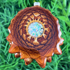 Our handmade pendants are crafted from sustainably wild-gathered Knobcone Pinecones. Every Aura Pinecone is carefully dried, aged, and cross-sectioned before being meticulously designed.