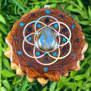 Our handmade pendants are crafted from sustainably wild-gathered Knobcone Pinecones. Every Aura Pinecone is carefully dried, aged, and cross-sectioned before being meticulously designed.