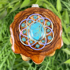 Our handmade pendants are crafted from sustainably wild-gathered Knobcone Pinecones. Every Aura Pinecone is carefully dried, aged, and cross-sectioned before being meticulously designed.