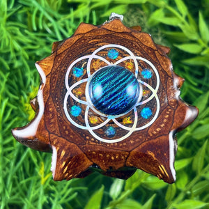 Our handmade pendants are crafted from sustainably wild-gathered Knobcone Pinecones. Every Aura Pinecone is carefully dried, aged, and cross-sectioned before being meticulously designed.