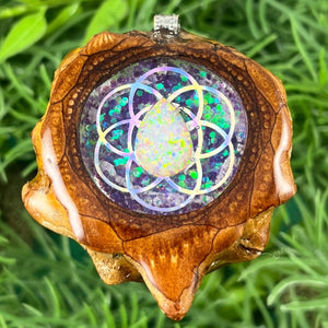 Our handmade pendants are crafted from sustainably wild-gathered Knobcone Pinecones. Every Aura Pinecone is carefully dried, aged, and cross-sectioned before being meticulously designed.
