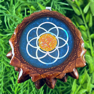 Our handmade pendants are crafted from sustainably wild-gathered Knobcone Pinecones. Every Aura Pinecone is carefully dried, aged, and cross-sectioned before being meticulously designed.