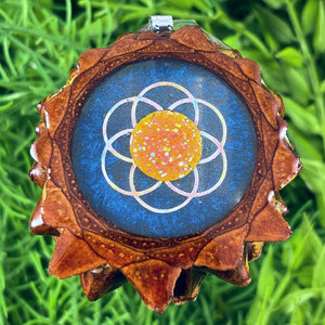 Our handmade pendants are crafted from sustainably wild-gathered Knobcone Pinecones. Every Aura Pinecone is carefully dried, aged, and cross-sectioned before being meticulously designed.