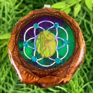 Our handmade pendants are crafted from sustainably wild-gathered Knobcone Pinecones. Every Aura Pinecone is carefully dried, aged, and cross-sectioned before being meticulously designed.