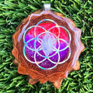 Our handmade pendants are crafted from sustainably wild-gathered Knobcone Pinecones. Every Aura Pinecone is carefully dried, aged, and cross-sectioned before being meticulously designed.