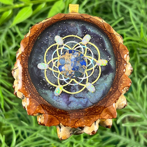 Our handmade pendants are crafted from sustainably wild-gathered Knobcone Pinecones. Every Aura Pinecone is carefully dried, aged, and cross-sectioned before being meticulously designed.