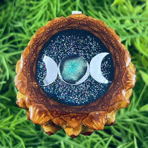 Our handmade pendants are crafted from sustainably wild-gathered Knobcone Pinecones. Every Aura Pinecone is carefully dried, aged, and cross-sectioned before being meticulously designed.