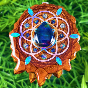 Our handmade pendants are crafted from sustainably wild-gathered Knobcone Pinecones. Every Aura Pinecone is carefully dried, aged, and cross-sectioned before being meticulously designed.