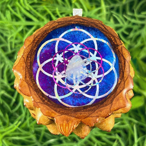 Our handmade pendants are crafted from sustainably wild-gathered Knobcone Pinecones. Every Aura Pinecone is carefully dried, aged, and cross-sectioned before being meticulously designed.
