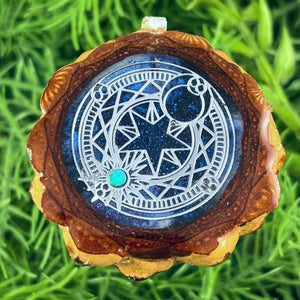 Our handmade pendants are crafted from sustainably wild-gathered Knobcone Pinecones. Every Aura Pinecone is carefully dried, aged, and cross-sectioned before being meticulously designed.