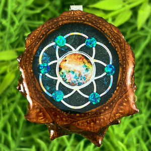 Our handmade pendants are crafted from sustainably wild-gathered Knobcone Pinecones. Every Aura Pinecone is carefully dried, aged, and cross-sectioned before being meticulously designed.