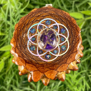 Our handmade pendants are crafted from sustainably wild-gathered Knobcone Pinecones. Every Aura Pinecone is carefully dried, aged, and cross-sectioned before being meticulously designed.