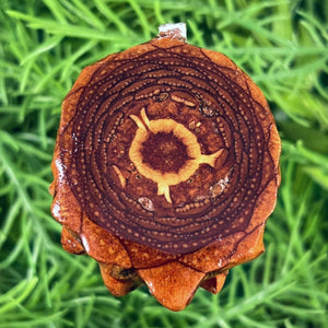 Our handmade pendants are crafted from sustainably wild-gathered Knobcone Pinecones. Every Aura Pinecone is carefully dried, aged, and cross-sectioned before being meticulously designed.