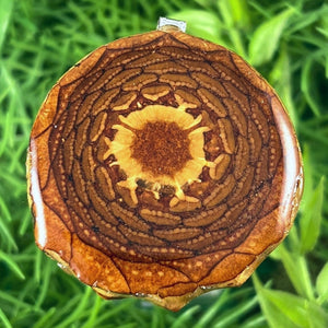 Our handmade pendants are crafted from sustainably wild-gathered Knobcone Pinecones. Every Aura Pinecone is carefully dried, aged, and cross-sectioned before being meticulously designed.