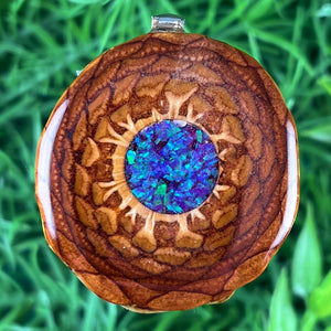 Our handmade pendants are crafted from sustainably wild-gathered Knobcone Pinecones. Every Aura Pinecone is carefully dried, aged, and cross-sectioned before being meticulously designed.