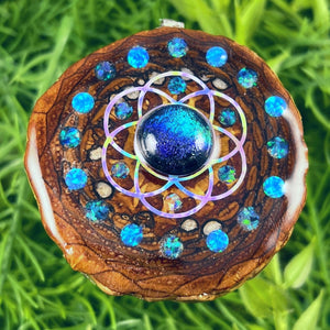 Our handmade pendants are crafted from sustainably wild-gathered Knobcone Pinecones. Every Aura Pinecone is carefully dried, aged, and cross-sectioned before being meticulously designed.