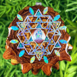 Our handmade pendants are crafted from sustainably wild-gathered Knobcone Pinecones. Every Aura Pinecone is carefully dried, aged, and cross-sectioned before being meticulously designed.
