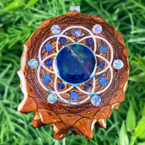 Our handmade pendants are crafted from sustainably wild-gathered Knobcone Pinecones. Every Aura Pinecone is carefully dried, aged, and cross-sectioned before being meticulously designed.