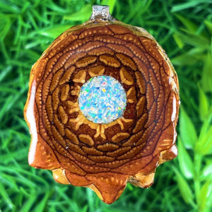 Our handmade pendants are crafted from sustainably wild-gathered Knobcone Pinecones. Every Aura Pinecone is carefully dried, aged, and cross-sectioned before being meticulously designed.